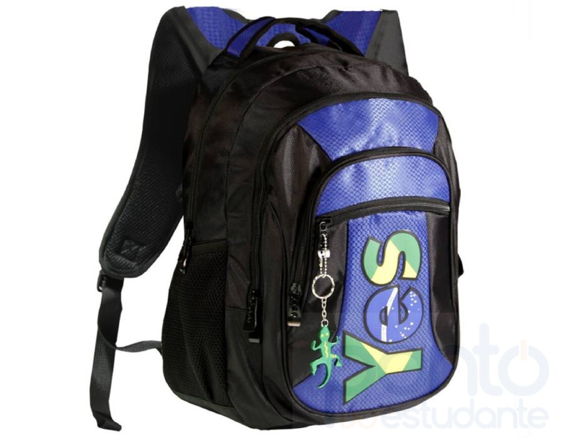 Mochila 4 divisões com Bolso Frontal-Alça tipo Camiseta. Bolso frontal de fácil acesso. Sistema comfort-back para maior conforto e proteção das costas. Estampa em silk com tema Brasil. Zíper em metal. Acompanha exclusivo chaveiro de lagartixa YES.