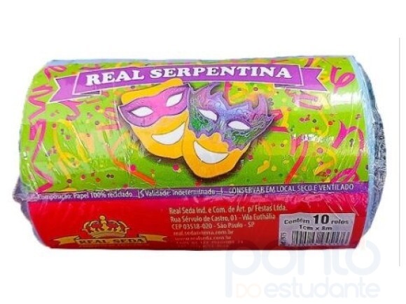 Serpentina pacote com 10 rolos de 8m e pacotes de cores sortidas.